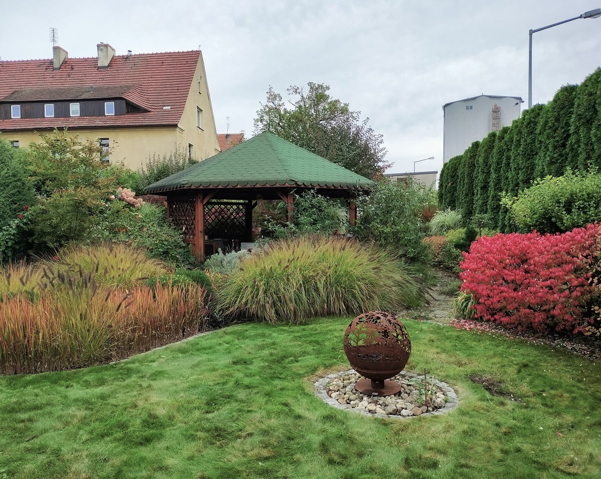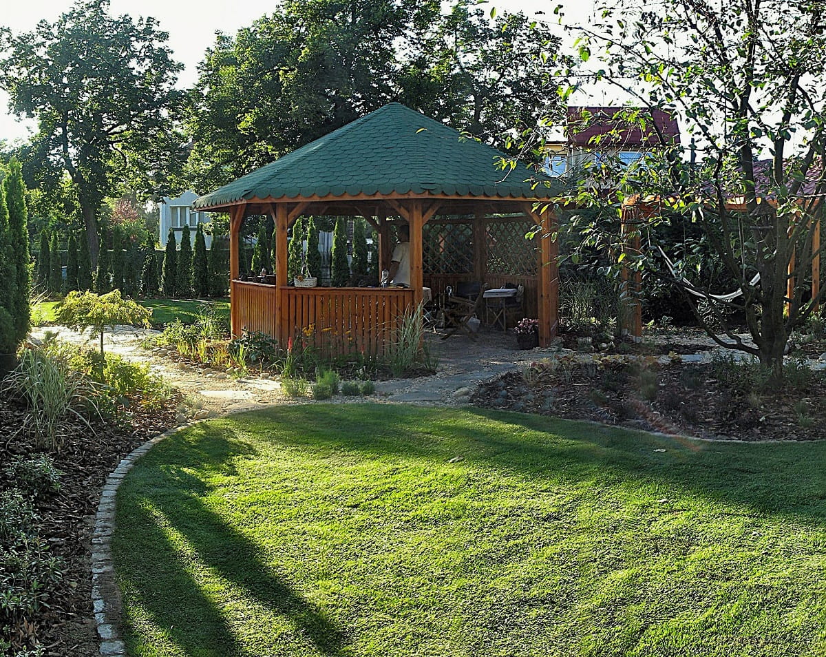 Ogród z drewnianą altaną